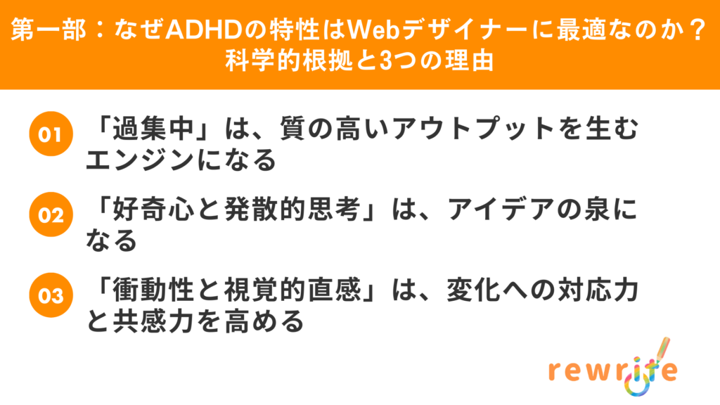 ADHDの特性がWebデザインの仕事に活かせるというのは、単なる精神論や希望的観測ではありません。近年の研究や専門家の間では、ADHDに関連する認知スタイルが、創造性や問題解決能力にプラスの影響を与える可能性が指摘されています。このセクションでは、科学的な知見を交えながら、ADHDの3つの主要な特性が、Webデザイナーの業務プロセスでいかに強力な「武器」となり得るのかを解き明かしていきます。