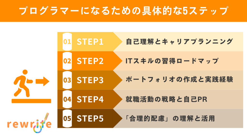 では、実際にプログラマーを目指すには、どのようなステップを踏めばよいのでしょうか。ここでは、就職の成功に向けた具体的な5つのステップをご紹介します。