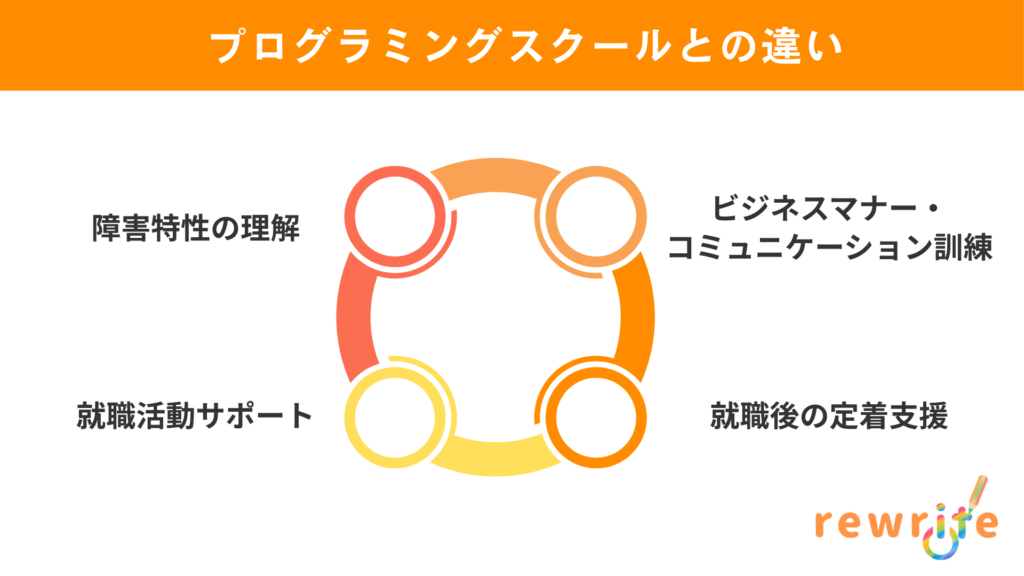 「ITスキルを学ぶならプログラミングスクールでも良いのでは?」と思うかもしれません。しかし、就労移行支援事業所、特に発達障害のある方の支援に特化した事業所には、スクールにはない大きな利点があります。