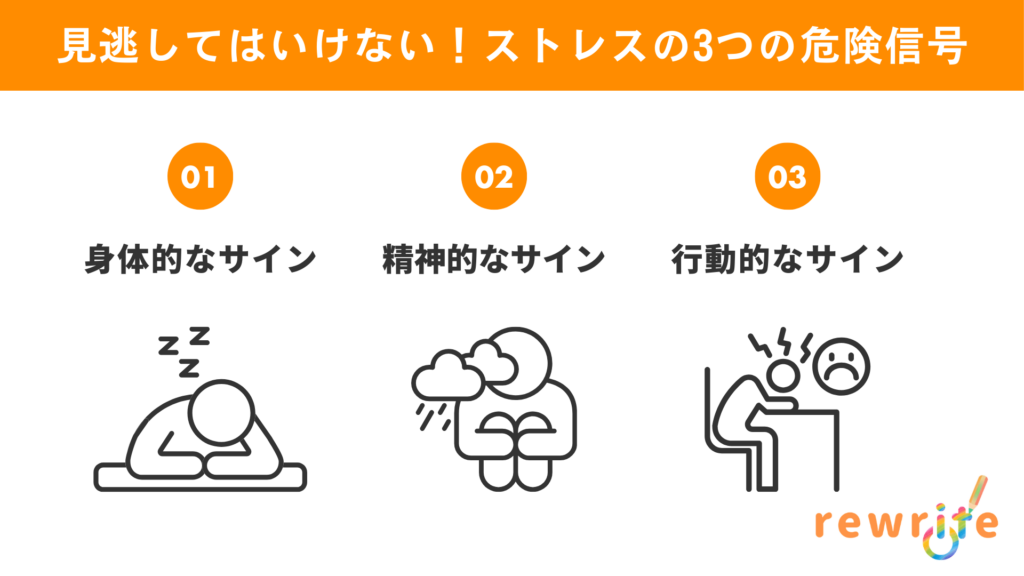 ストレスのサインは、「身体」「精神」「行動」の3つの側面に現れます。これらは互いに連動しており、一つに気づけば他のサインも見つかることがよくあります。自分に当てはまるものがないか、チェックリストとして活用してみてください。