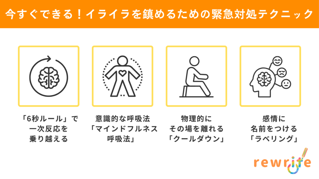 イラッとしたその瞬間に、感情の爆発を回避するための具体的な方法です。これらは「応急処置」として非常に有効です。いくつか覚えておき、自分に合ったものを試してみてください。