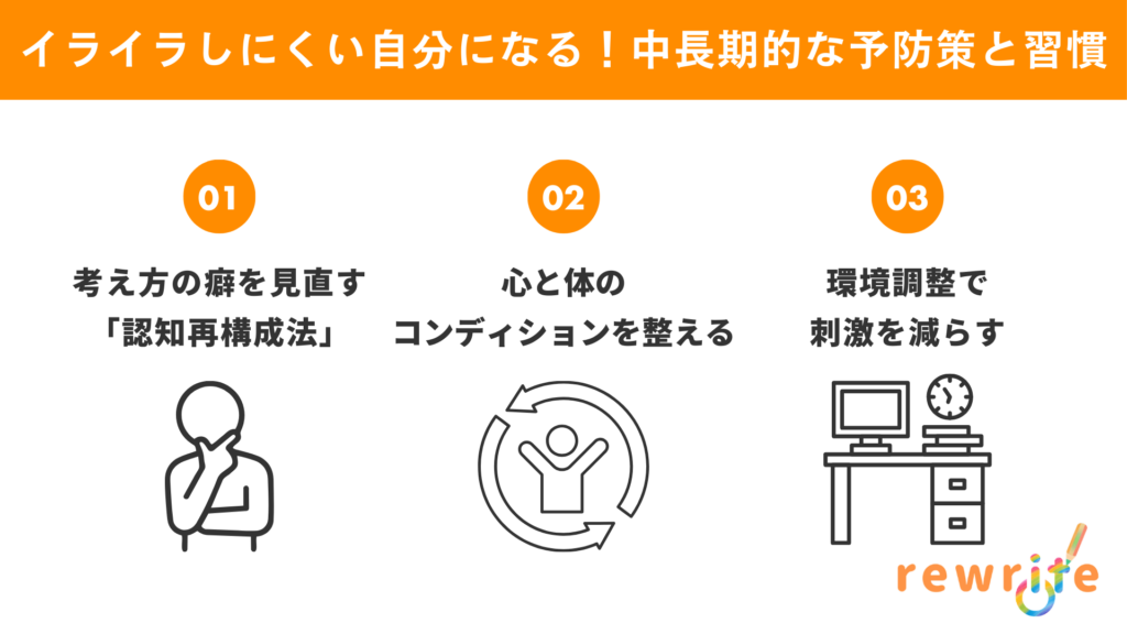 その場しのぎのテクニックだけでなく、根本的にイライラしにくい心身の状態を作るための、中長期的なアプローチが不可欠です。これが、長く安定して働くための土台となります。