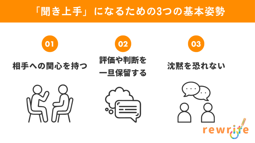 「この人は何を伝えたいのだろう?」「どんな気持ちで話しているのだろう?」と、相手自身に興味を持つことがスタートです。うわべだけで聞くのではなく、純粋な好奇心を持って相手に向き合う姿勢が、自然な相槌や質問につながります。