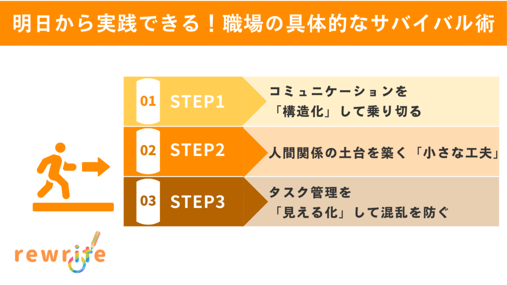 自分の特性を理解した上で、次は具体的な対策を講じていきましょう。ここでは、感覚的に「空気を読む」のではなく、論理と工夫で職場を乗り切るための3つのステップを紹介します。